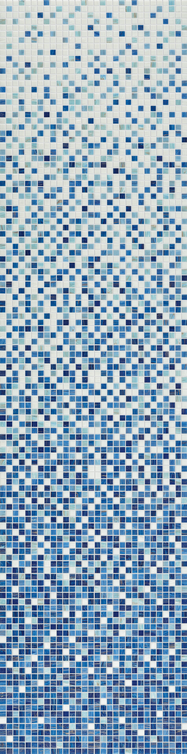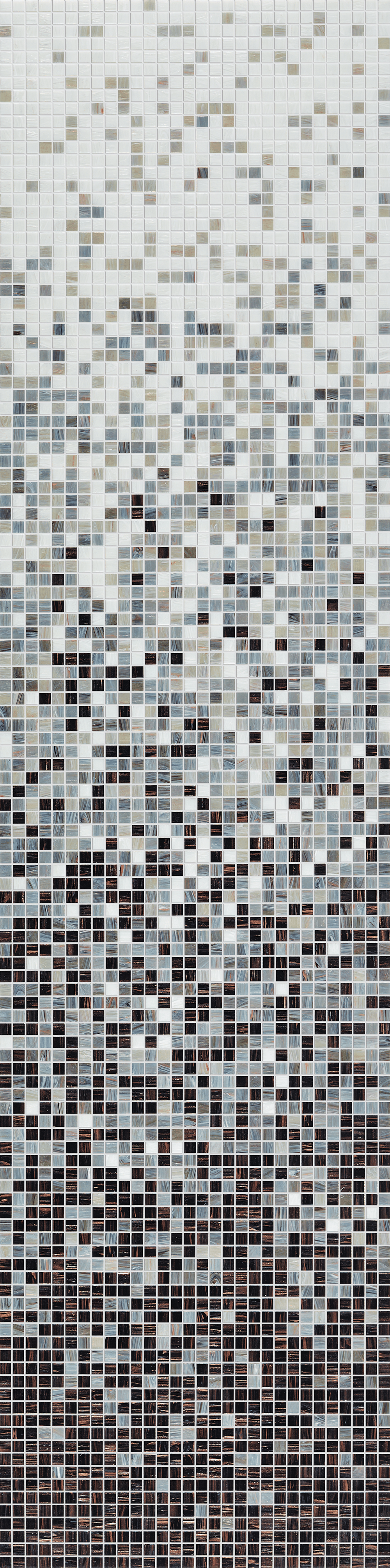 A procurar...Mosaico de vidro constituído por peças biseladas, montadas sobre rede. O degradé é formado por 8 folhas diferentes a aplicar verticalmente, perfazendo uma altura de aproximadamente 2,57ml. Cada caixa contém duas faixas verticais de 8 folhas diferentes, para revestimento de 1,66m2 de superfície. Aplicação universal.